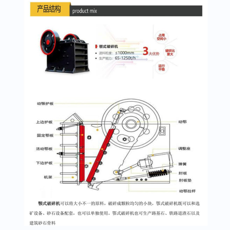 顎式破碎機(jī)是出現(xiàn)較早的破碎設(shè)備,因其構(gòu)造簡單、堅(jiān)固、工作可靠、維護(hù)和檢修容易以及生產(chǎn)和建設(shè)費(fèi)用比較少,因此,直到現(xiàn)在仍然廣泛地在冶金、化工、建材、電力、交通等工業(yè)部門,用于破碎抗壓強(qiáng)度在147~245MPa的各種礦石和巖石的粗、中、細(xì)碎。